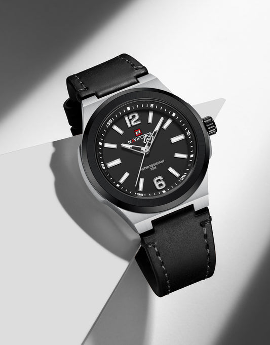 Naviforce NF9233 black and Silver with leather strap Analog Watch