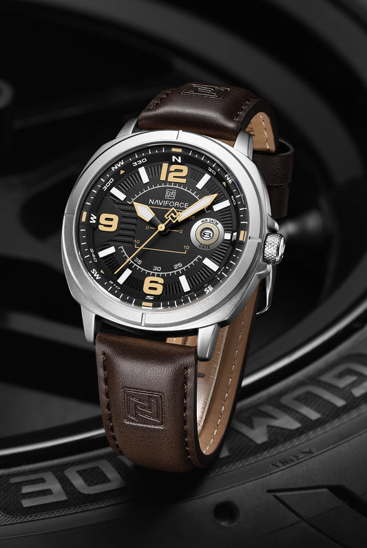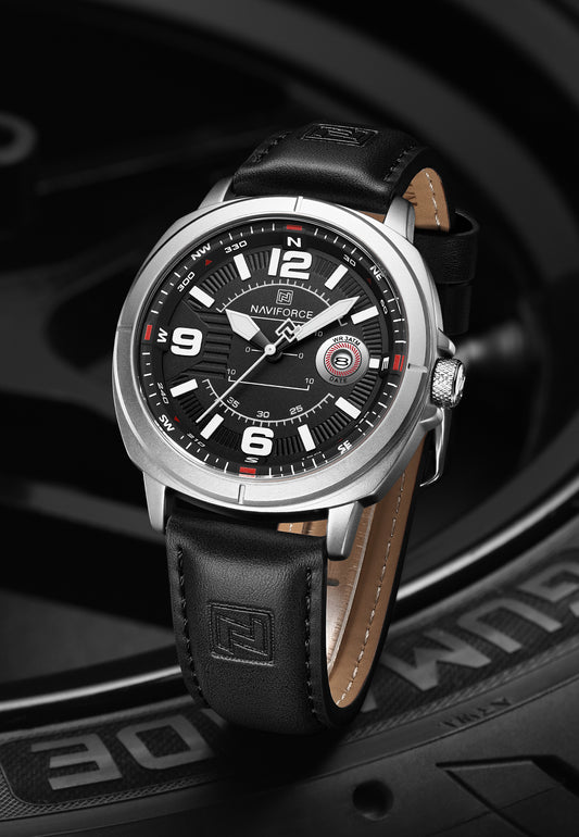 Naviforce NF8078 silver dial with black leather strap Analog Watch