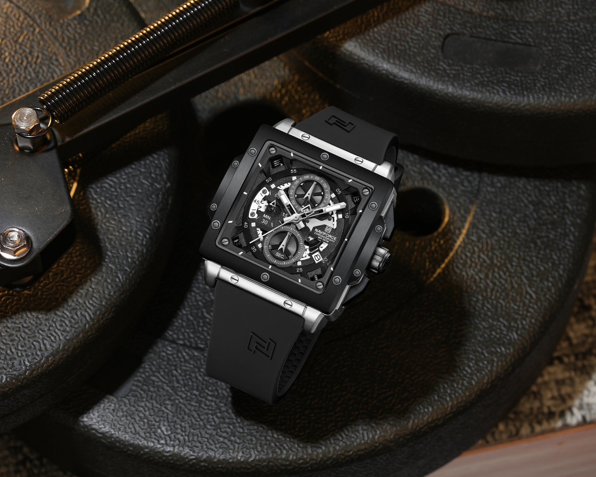 Its bold square chronograph dial, complemented by a durable silicone band, delivers a modern, sleek look that appeals to a wide range of customers.