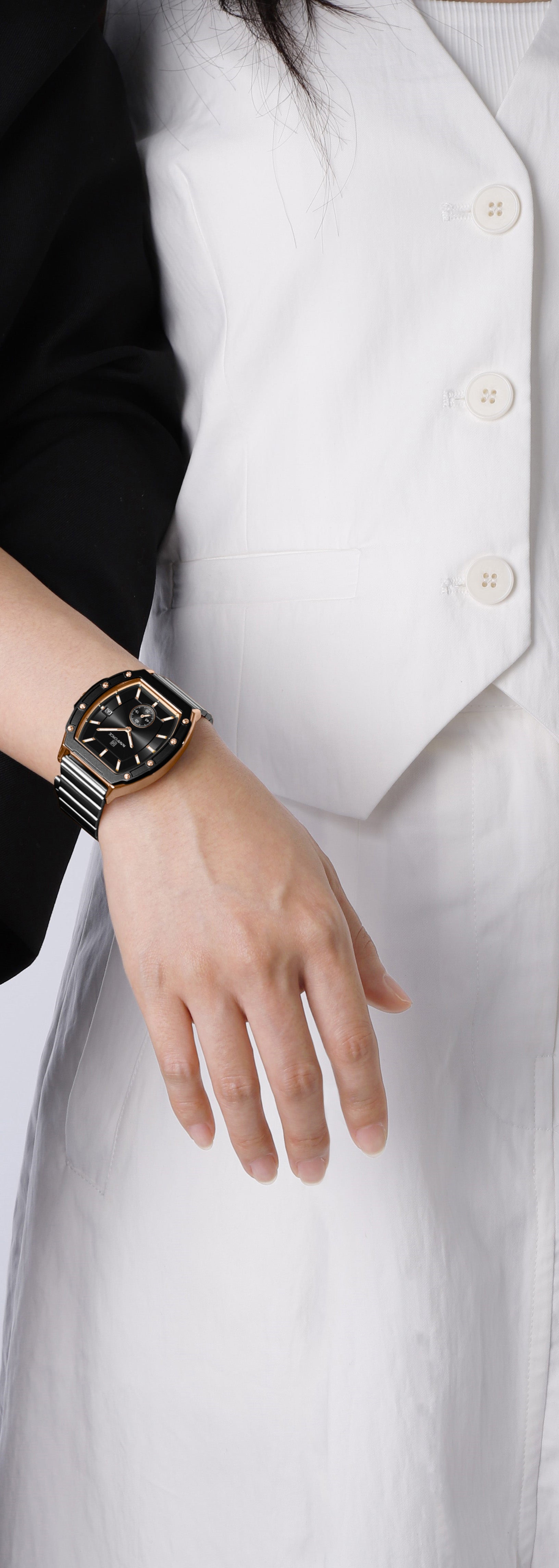 Crafted with a unique tonneau-shaped case, this timepiece features a sophisticated black dial accented by rose gold-toned hour markers and screws, offering a perfect contrast for a refined aesthetic.