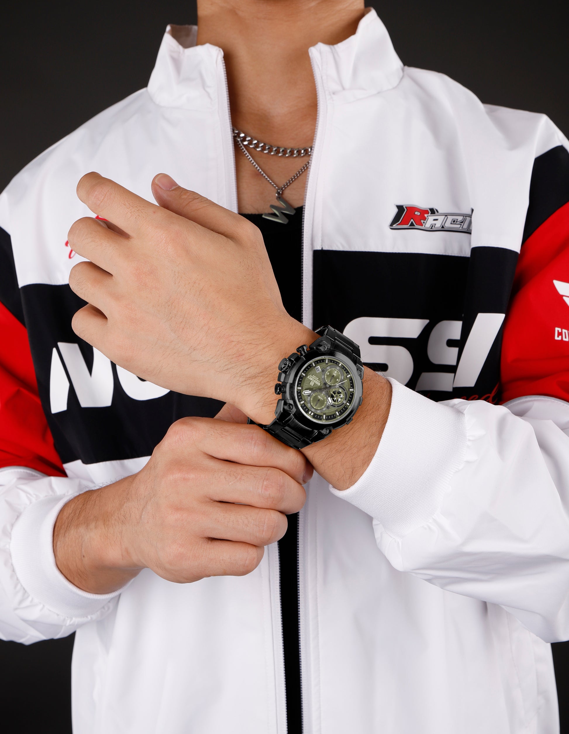 Designed for those who thrive in tough terrains and high-energy environments, this watch effortlessly merges tactical strength with premium style.