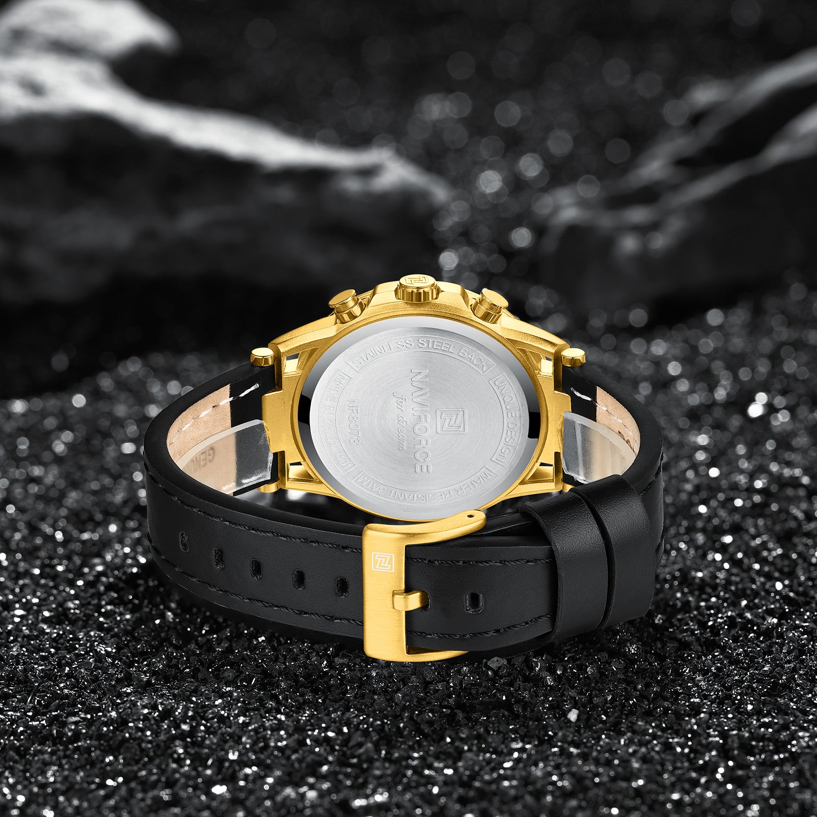 Naviforce NF8073 Unique Gold Dial With Black Leather Analog Watch