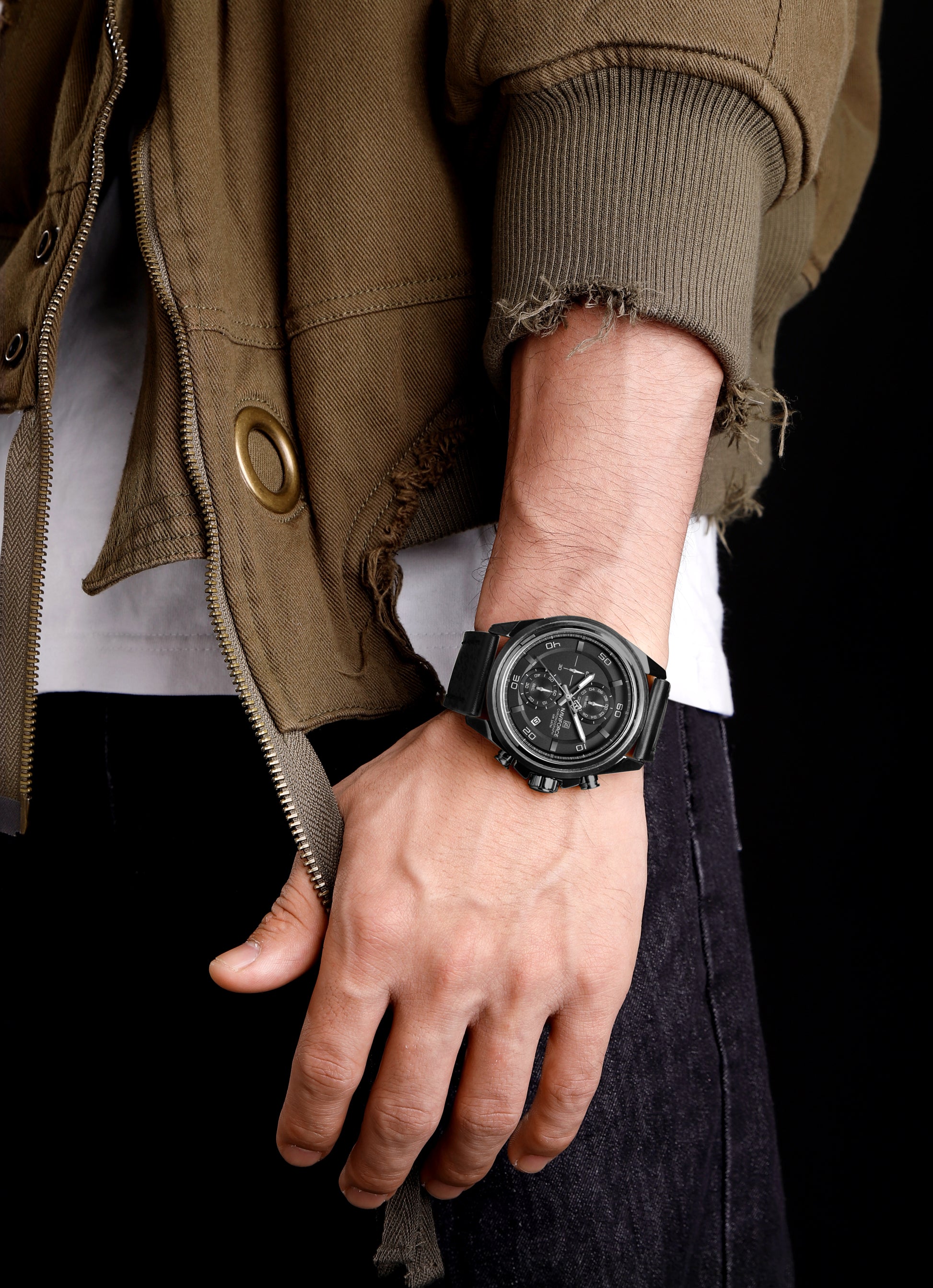 Encased in a bold black stainless-steel body, this watch features a rich, textured dial with minimalist silver markers, multifunction sub-dials, and a neatly integrated date window.