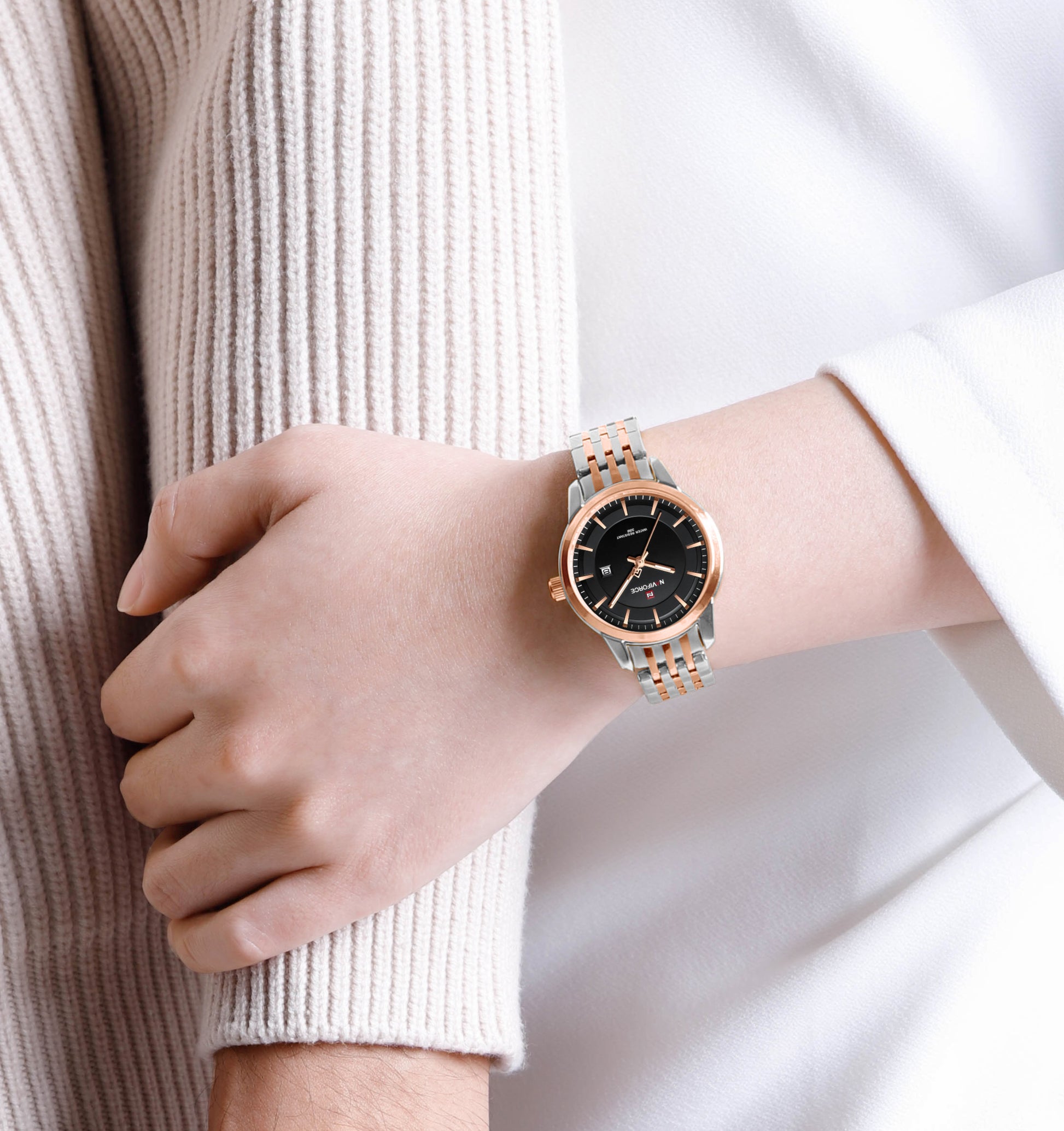 The two-tone stainless steel bracelet, showcasing a sophisticated interplay of silver and rosegold tones, offers both visual appeal and all-day comfort.