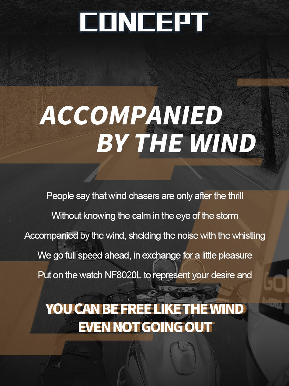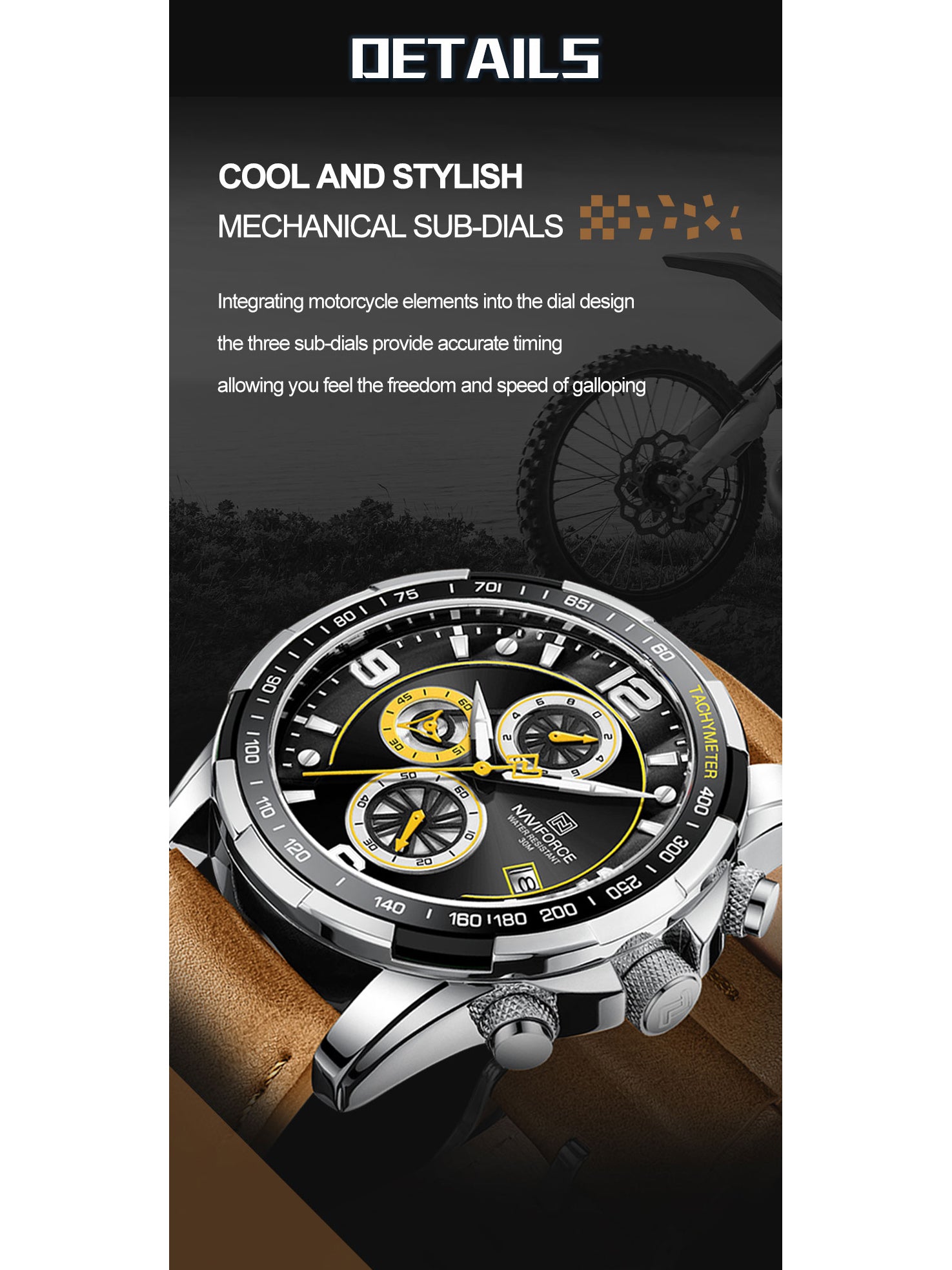 NF8020L – A Pinnacle of Stylish Design. Experience the pinnacle of style and functionality with the NAVIFORCE NF8020L. Seamlessly integrating motorcycle elements, it features cool and stylish mechanical sub-dials for precise timing, immersing wearers in the exhilarating sense of freedom and speed. The watch boasts an endless and dominating tachymeter bezel, embodying the essence of racing and empowering individuals to transcend boundaries, unlocking maximum potential with a fervent racing spirit. Crafted from soft and captivating genuine leather, the eye-catching casual strap adds a vanguard touch to fashion statements. The adjustable pin buckle ensures embodiment of ease and freedom associated with the wind. With outstanding quartz chronograph functionality, luminous coatings for clear time reading in darkness, and 3ATM waterproof capability, the NF8020L symbolizes durability and resilience in any environment. Elevate wrist game, make a statement, and embrace the thrill of racing with NAVIFORCE NF8020L.
