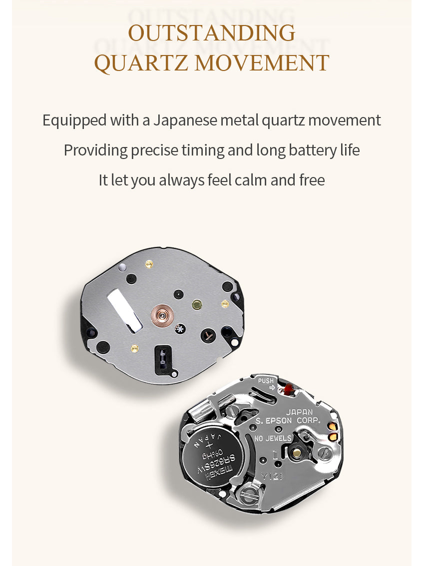 The finely polished metal bezel adds a touch of luxury to your wrist, while the Japanese quartz movement ensures precision and lasting battery life.