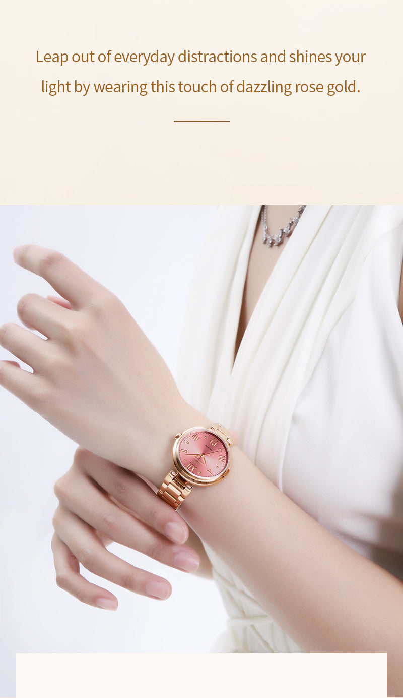 ● Lustrous Allure: Bask in the sunburst dial's soft glow, complemented by classic Roman numerals. A delicate rose gold bracelet adds a proper metallic texture that's chic, minimalist, and modern.