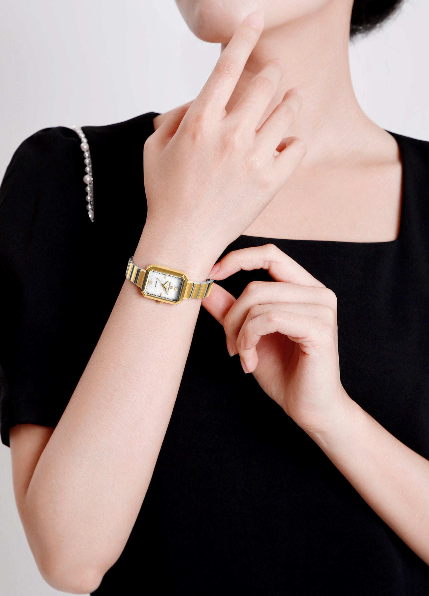Featuring a refined rectangular gold-tone dial with delicate Roman numeral markers, this timepiece exudes a subtle luxurious charm.