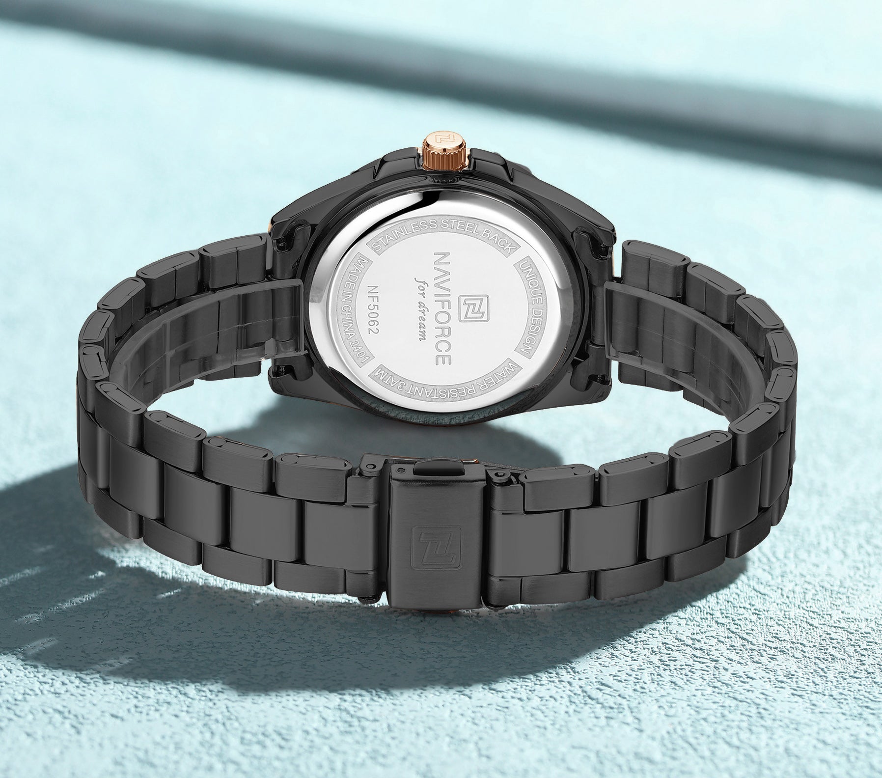 This NAVIFORCE watch exudes modern sophistication with its all-black design, accented by striking rose gold details.