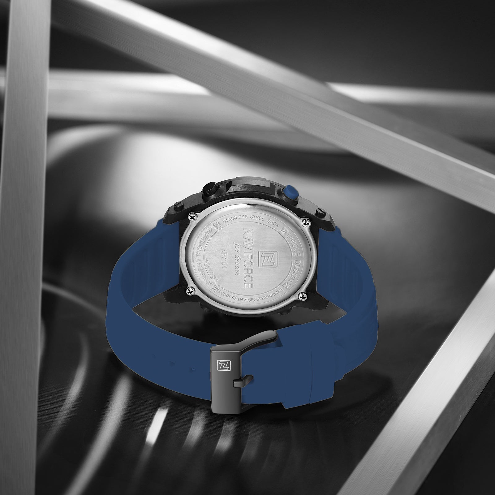 This rugged and versatile digital watch from Naviforce, model NF7104, is designed for the adventurous spirit.