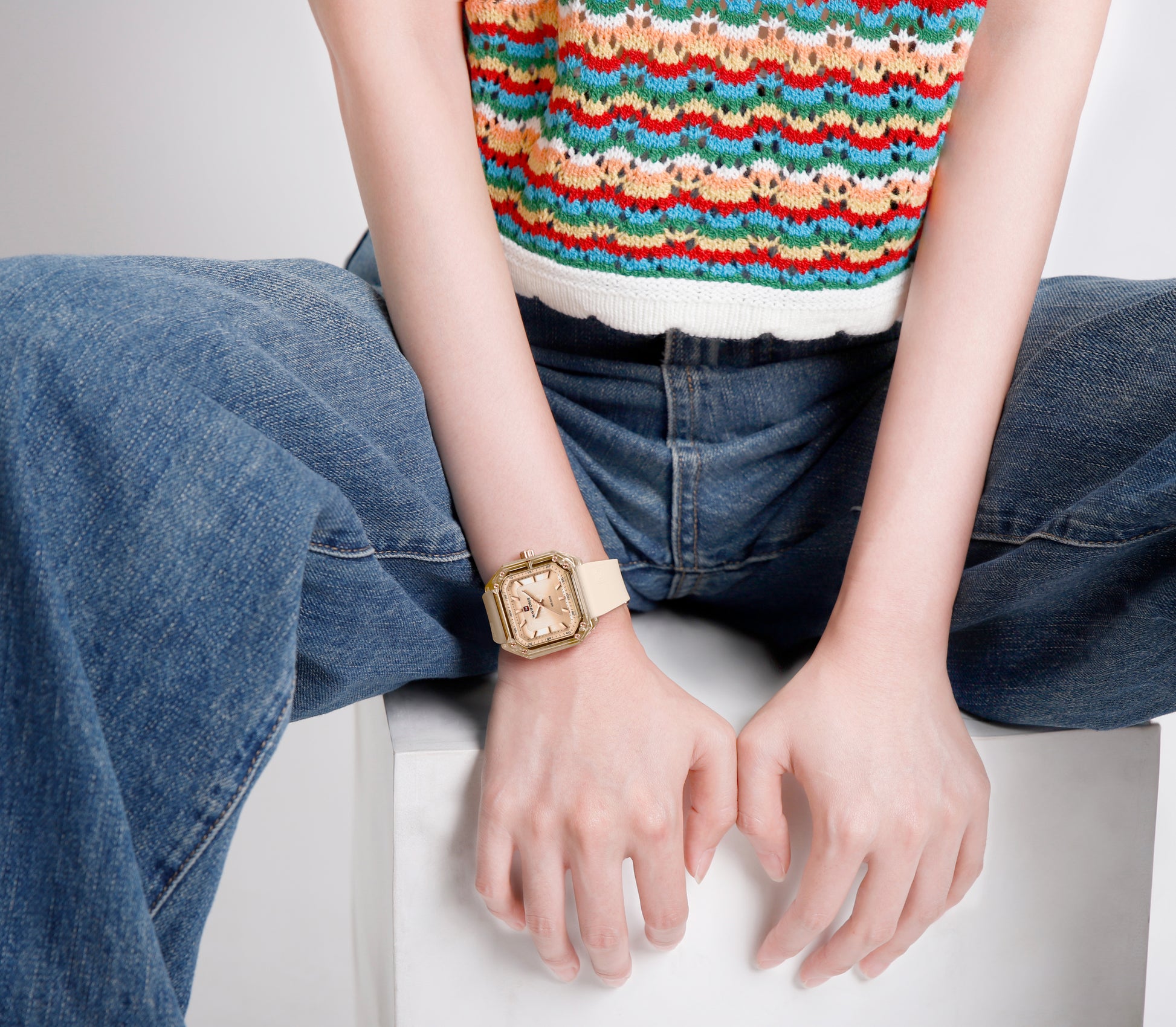 Its transparent square case, featuring beveled corners and eight rose gold-colored metal studs, pairs harmoniously with matching pointers and hour markers, softening the square shape’s rigidity and enhancing its unique character.