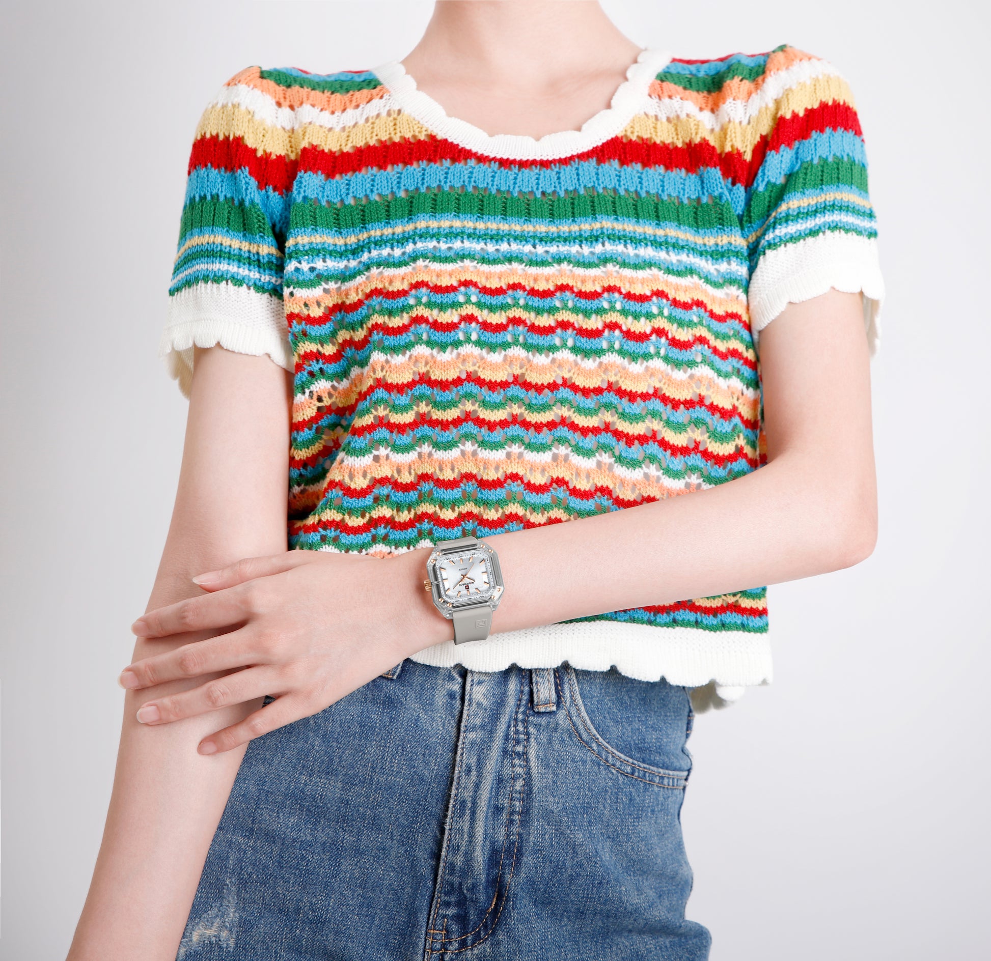 Its transparent square case, featuring beveled corners and eight rose gold-colored metal studs, pairs harmoniously with matching pointers and hour markers, softening the square shape’s rigidity and enhancing its unique character.