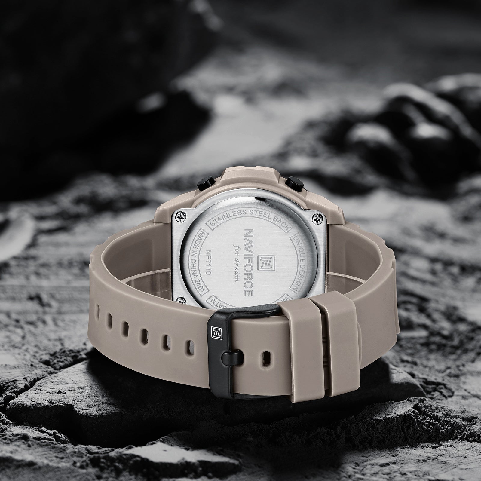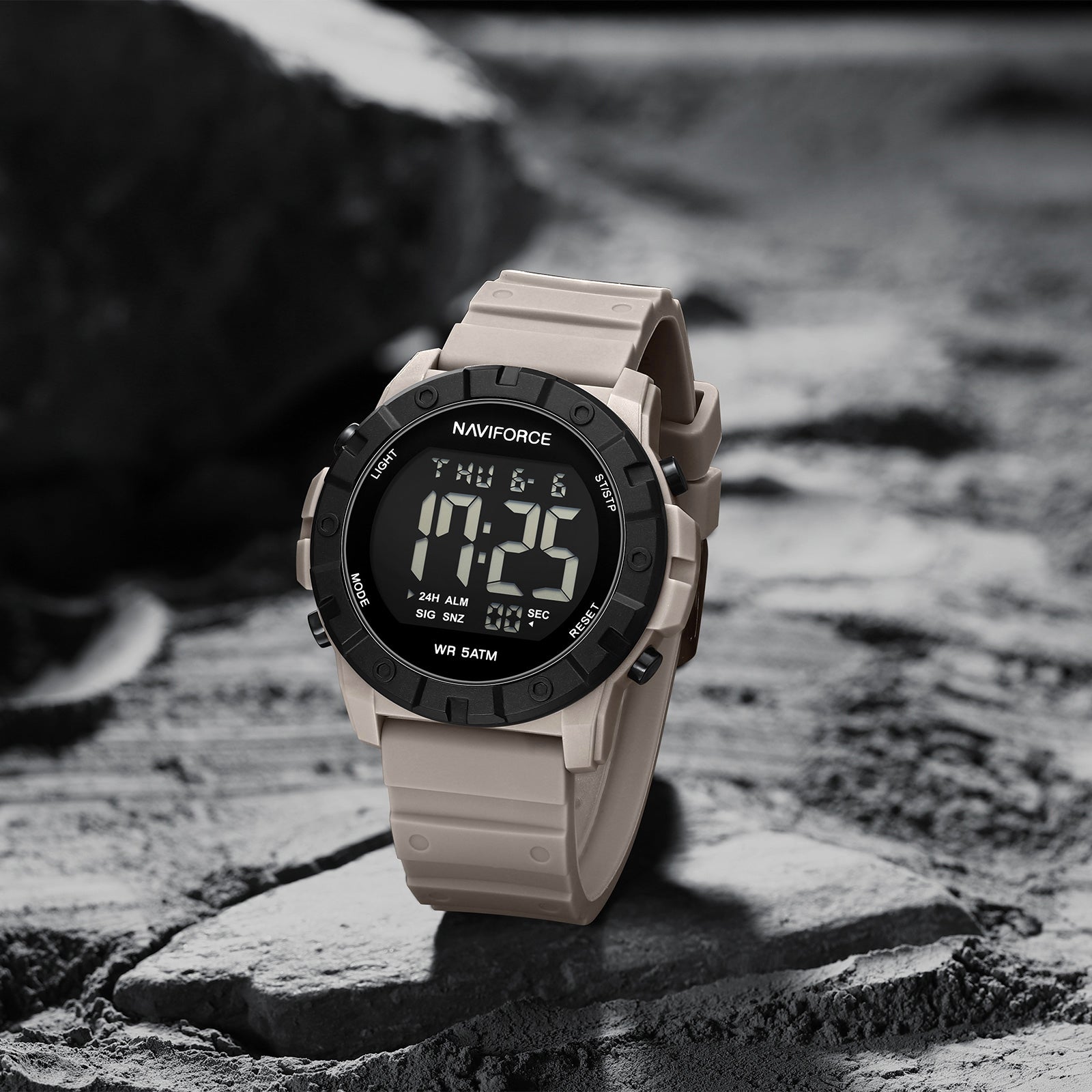 This robust and functional digital watch, the Naviforce NF7110, is engineered for durability and clear readability.