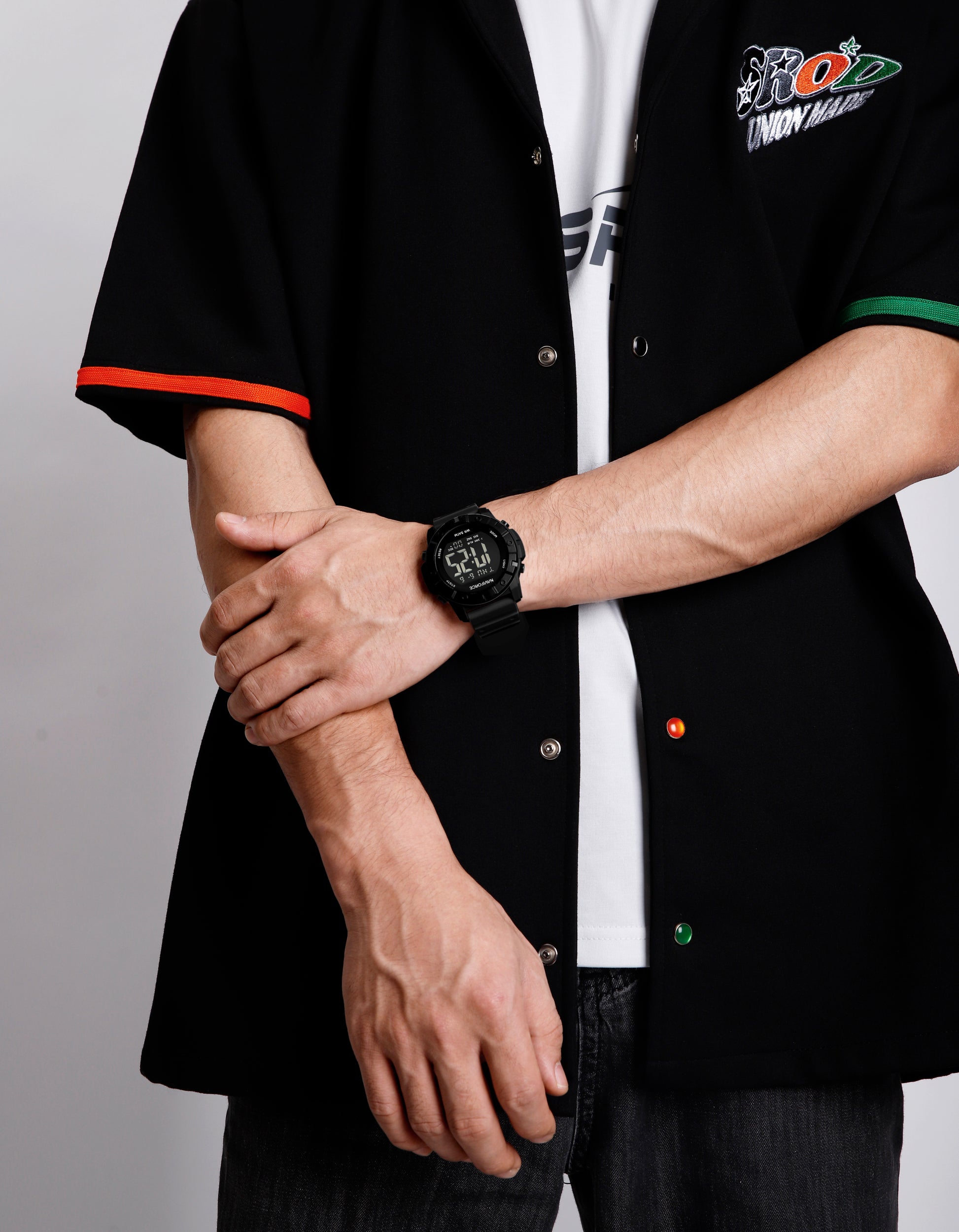 The crisp digital display provides essential information at a glance, including time, day, and date, complemented by additional functions like alarm and stopwatch.