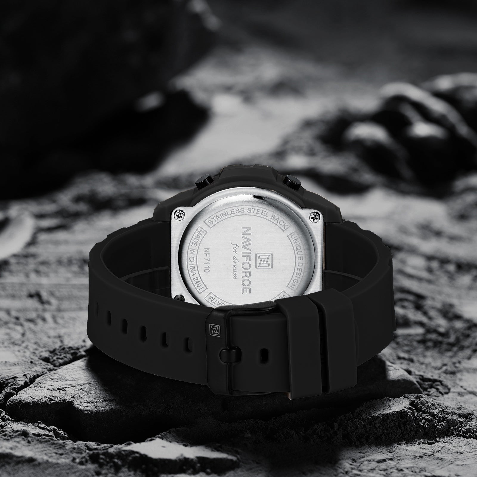 This robust and functional digital watch, the Naviforce NF7110, is engineered for durability and clear readability.