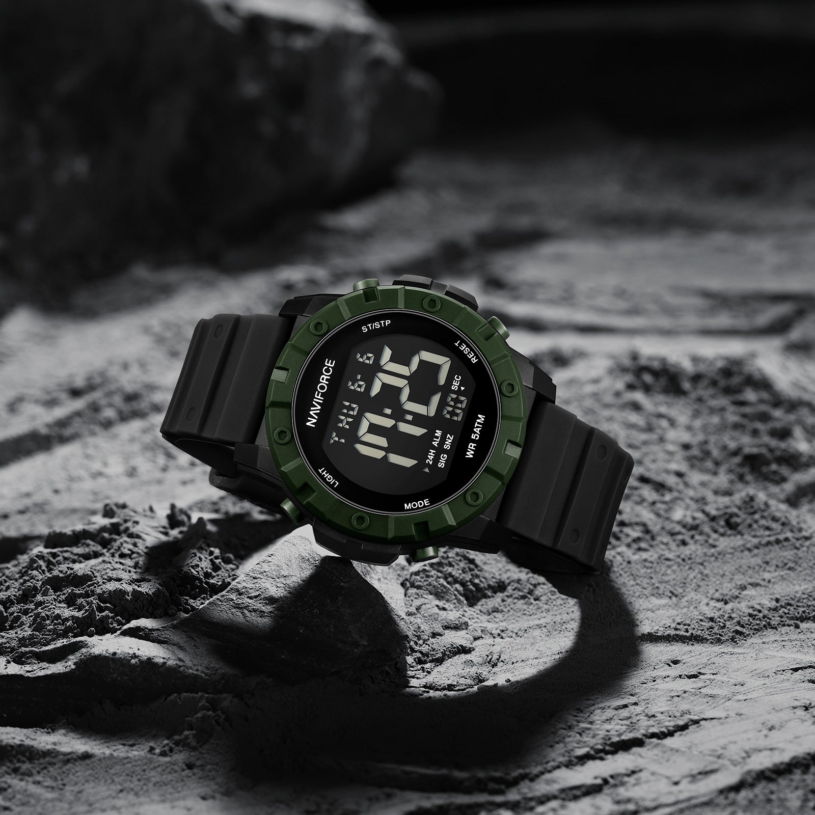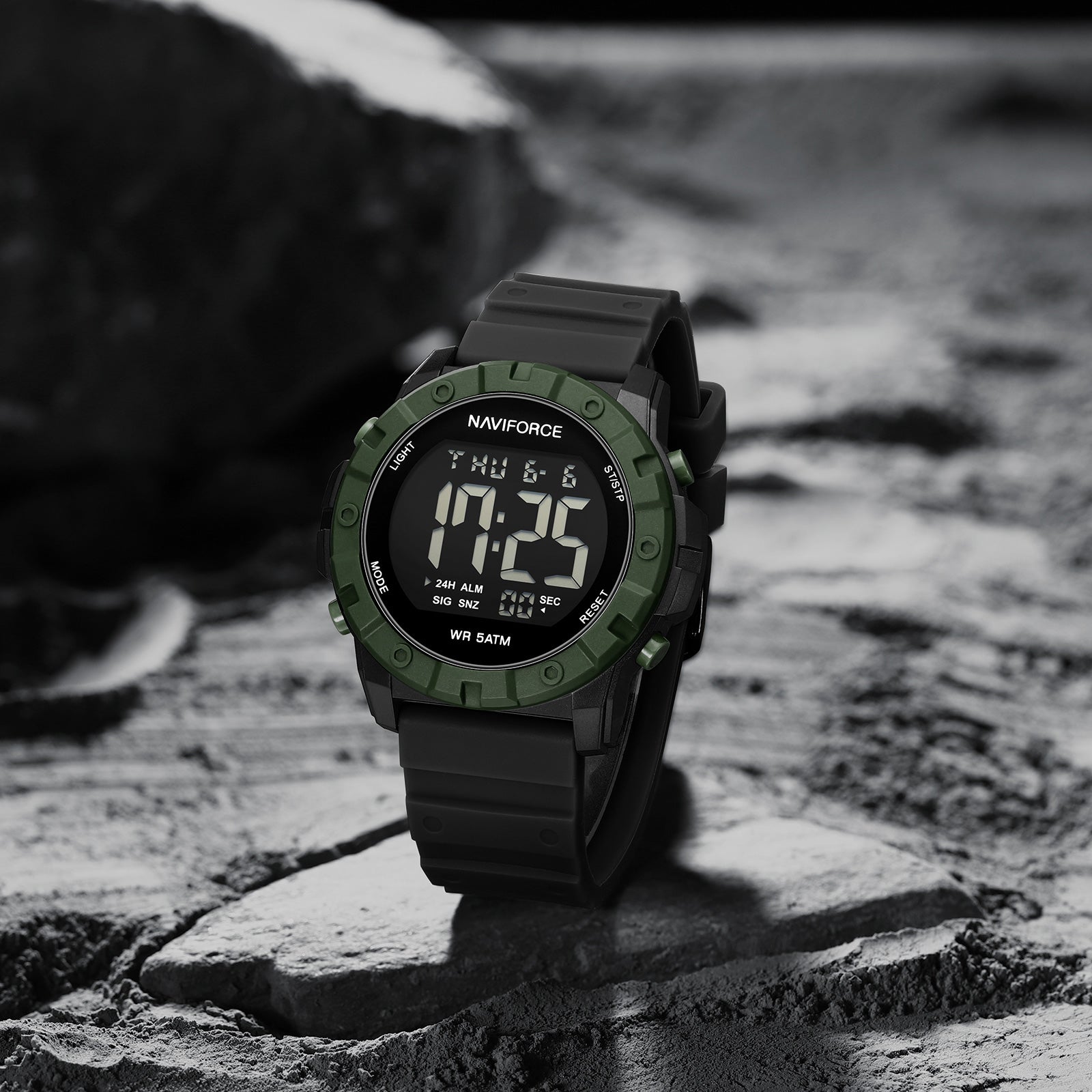 This robust and functional digital watch, the Naviforce NF7110, is engineered for durability and clear readability.