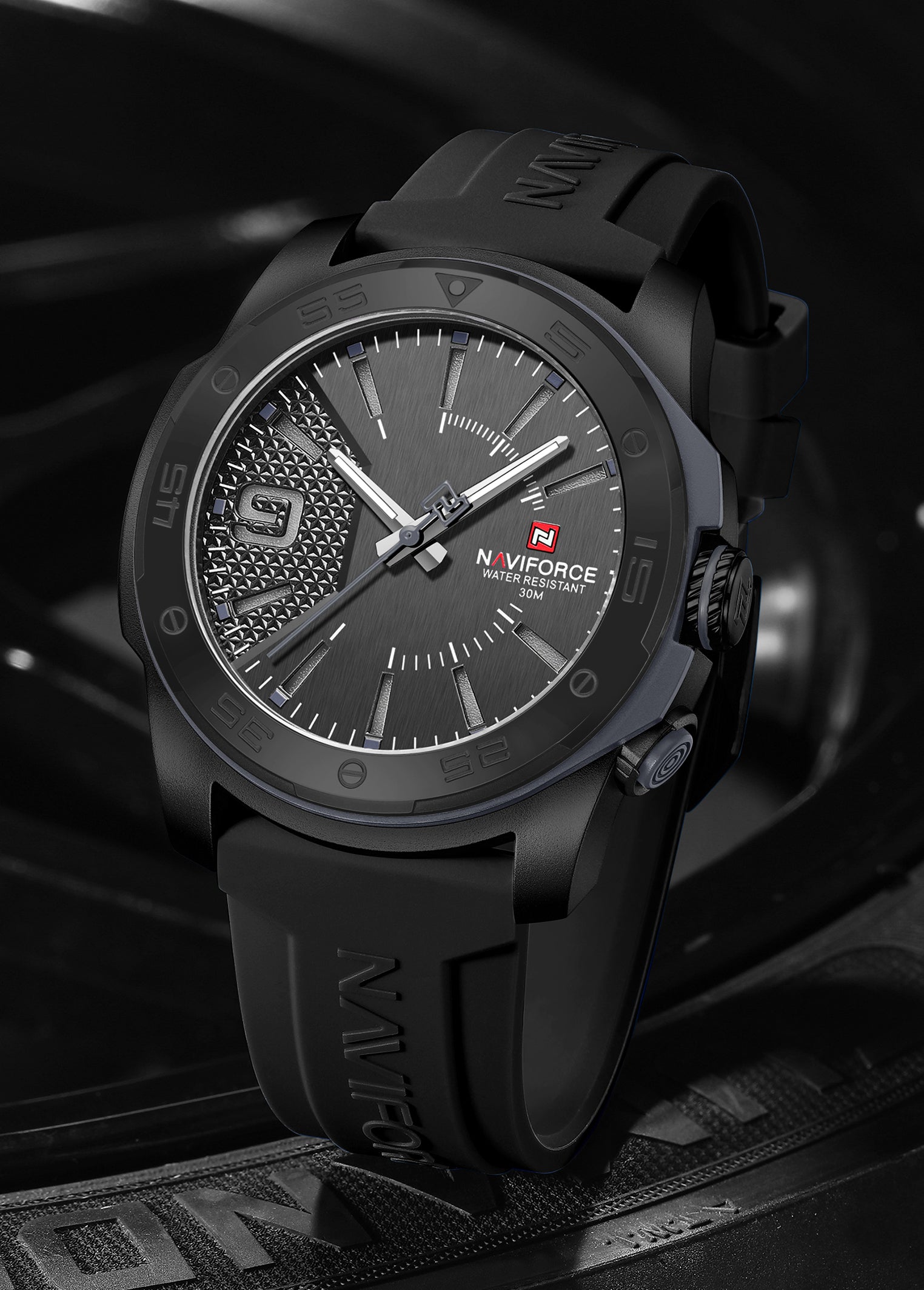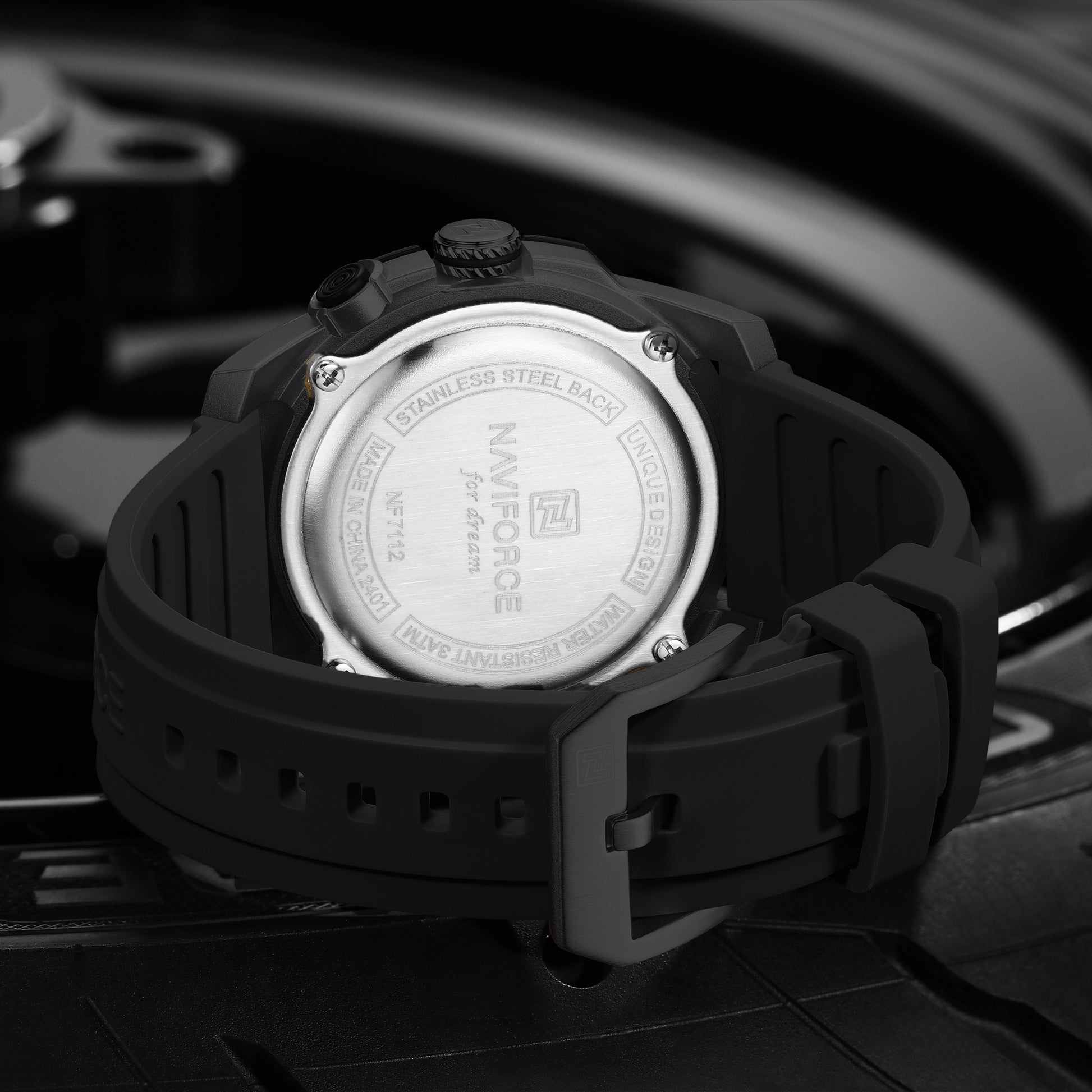 This striking Naviforce NF7112 timepiece exudes a powerful and modern aesthetic, featuring an all-black design that commands attention.