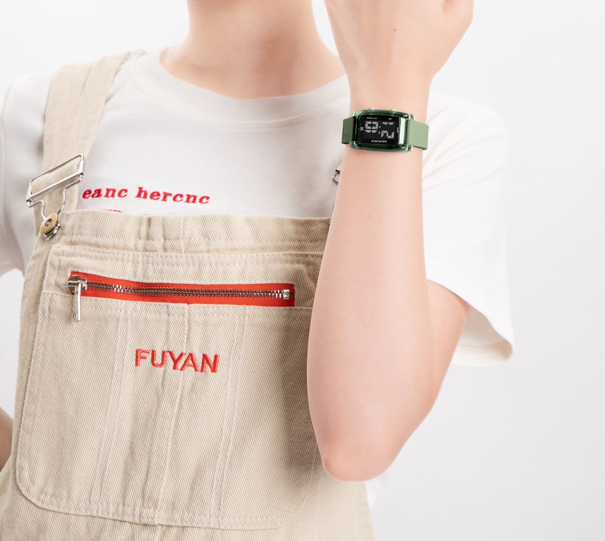 It features a streamlined black case and a comfortable, flexible green silicone strap, creating a cohesive and modern aesthetic.