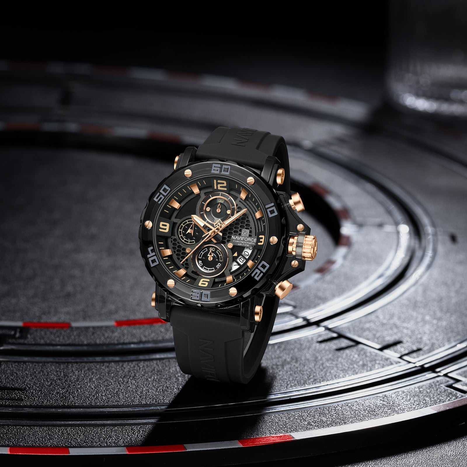 This commanding Naviforce men's chronograph watch exudes a powerful and sophisticated presence with its bold black and rose gold aesthetic.