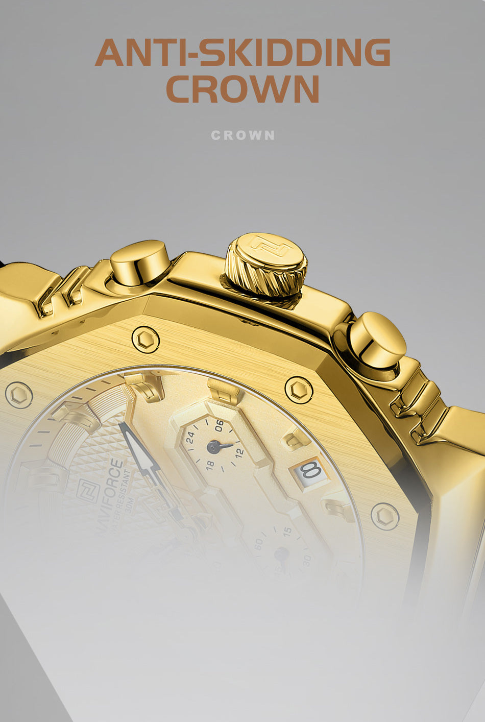 The novel screw-shaped crown of NF8035 not only enhances its aesthetic appeal but also increases friction, making time adjustment a breeze and ensuring ease of use.